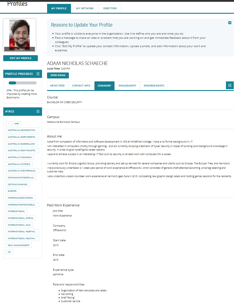 In terms of skills, according to the Deakin Career Skills Audit I have strong abilities in: